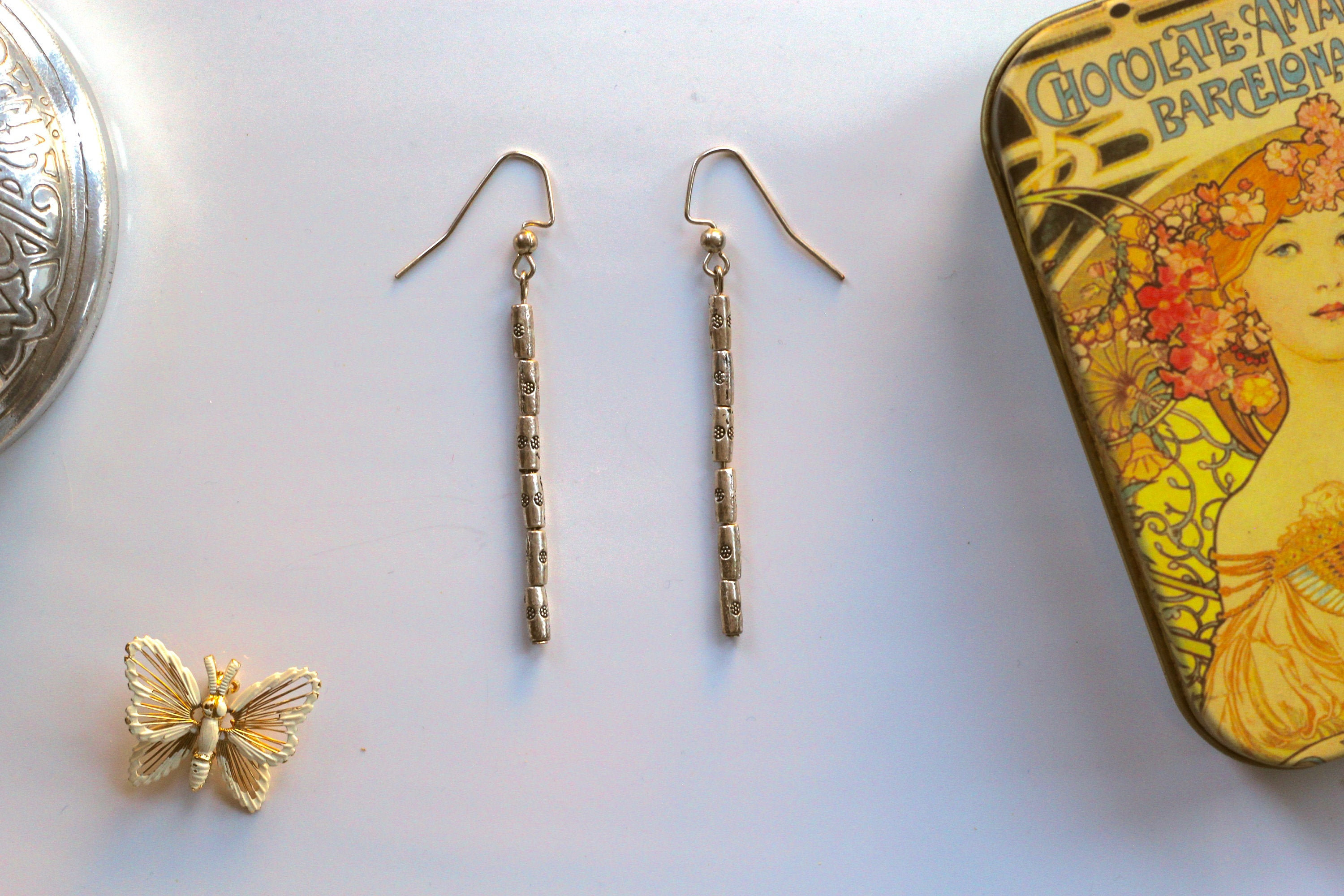 Silver drop bar earrings, Silver dangle earrings, Silver beaded earrings, Silver engraved earrings, Silver bar cylindrical drop, Round bar