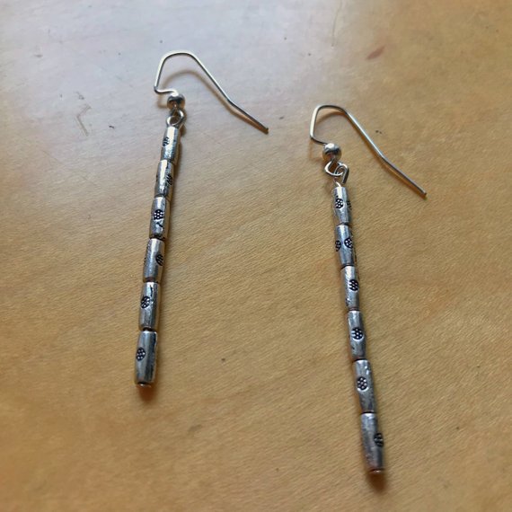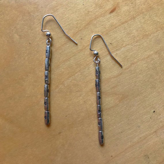 Silver Circular Cylinder Flower Engraved Seed Beaded Bar Drop Earrings