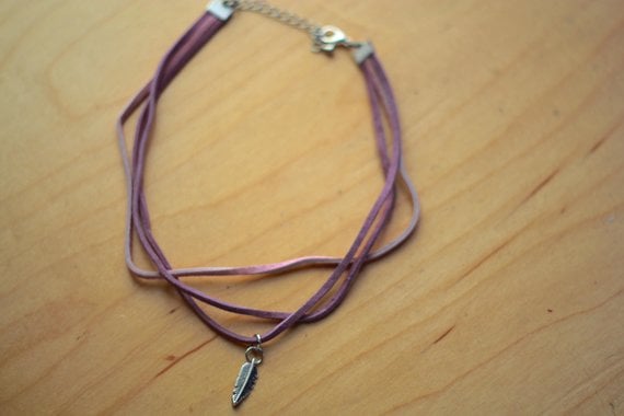 Triple Strand Pink Purple Suede Wrap Layer Cord Choker Necklace with Silver Feather Charm
