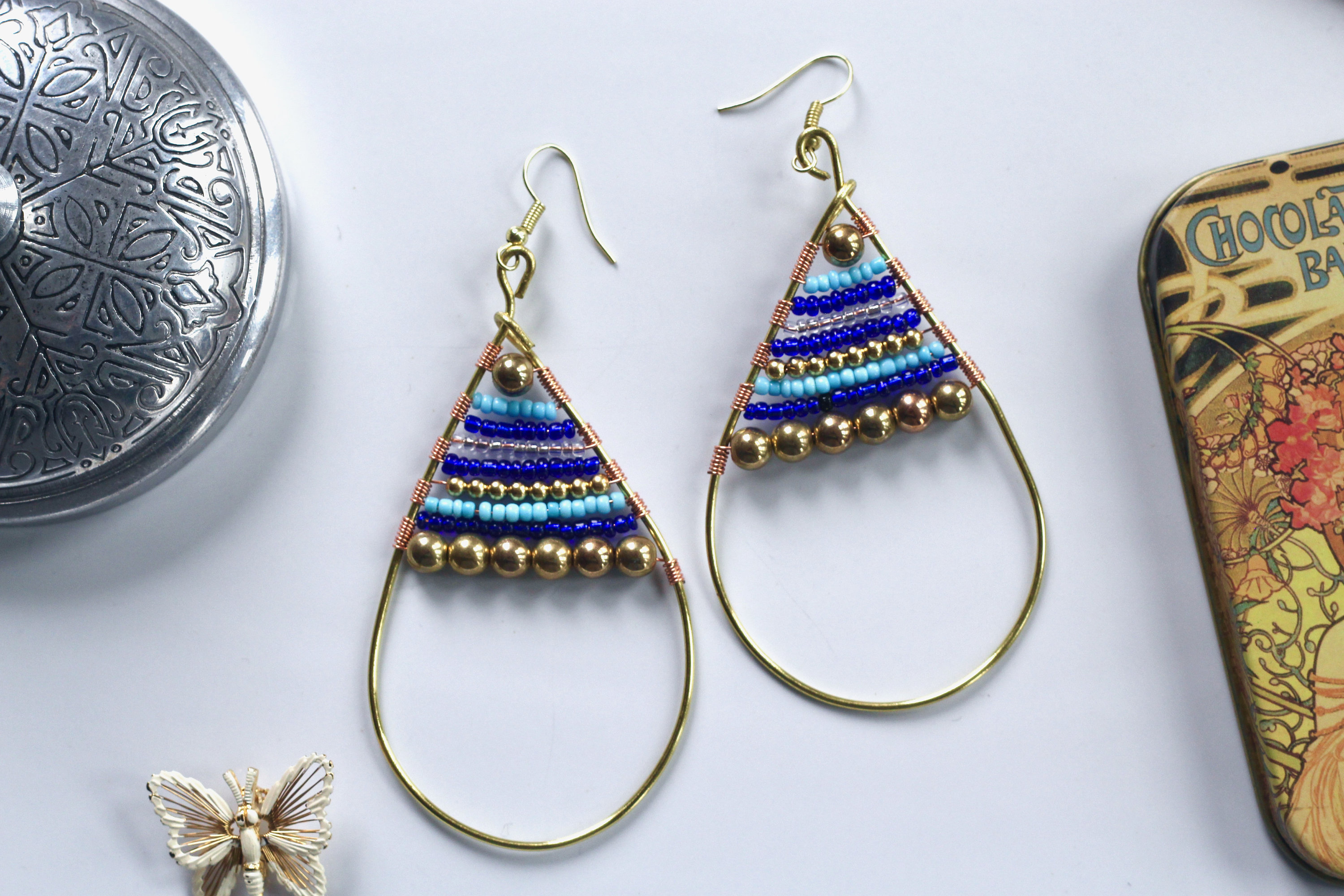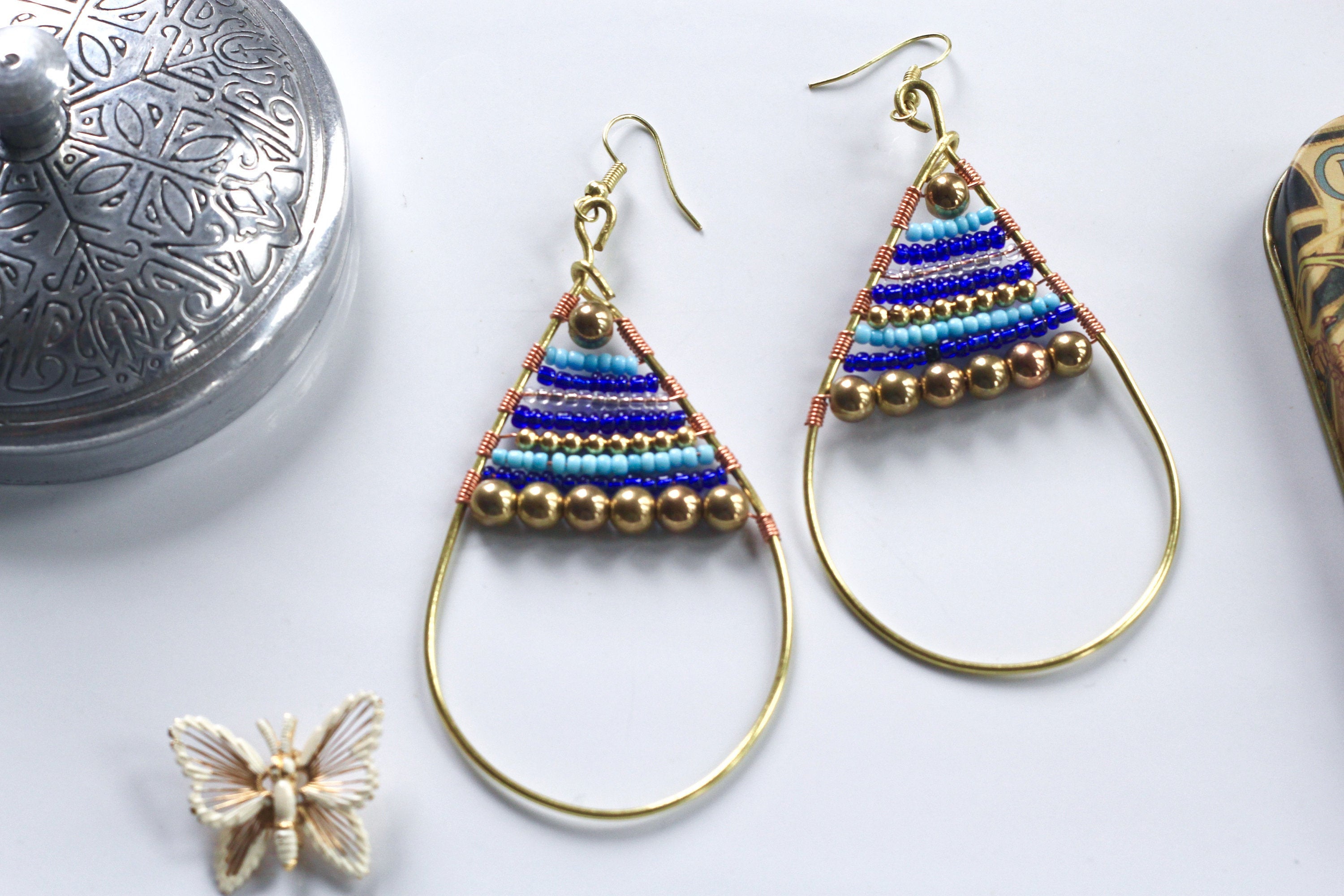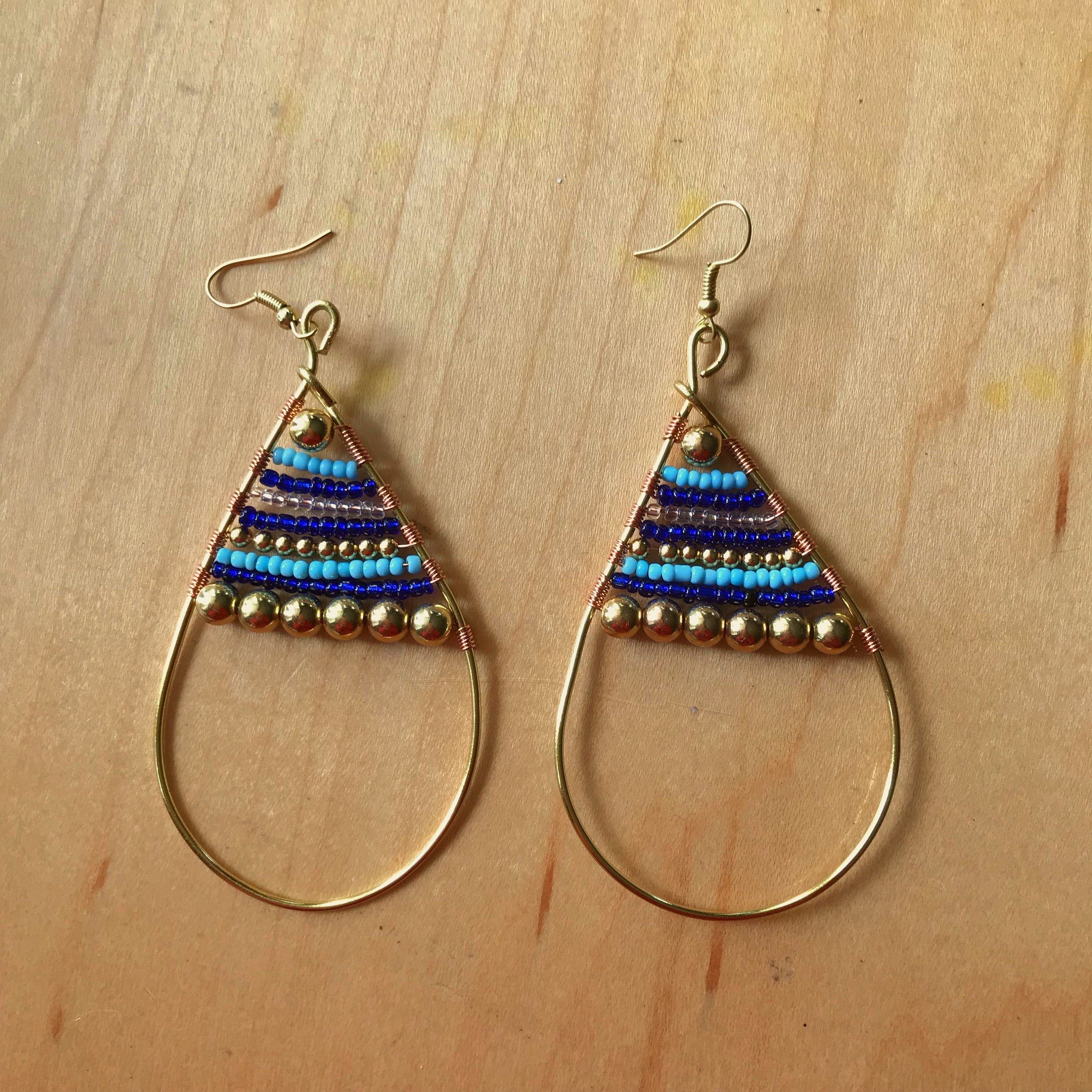 Turquoise Gold Indigo Bead Filled Gold Tear Drop Earrings, Seed Bead Tear Drop Earrings, Bead-filled, Gold Wire Wrap Tear Drops