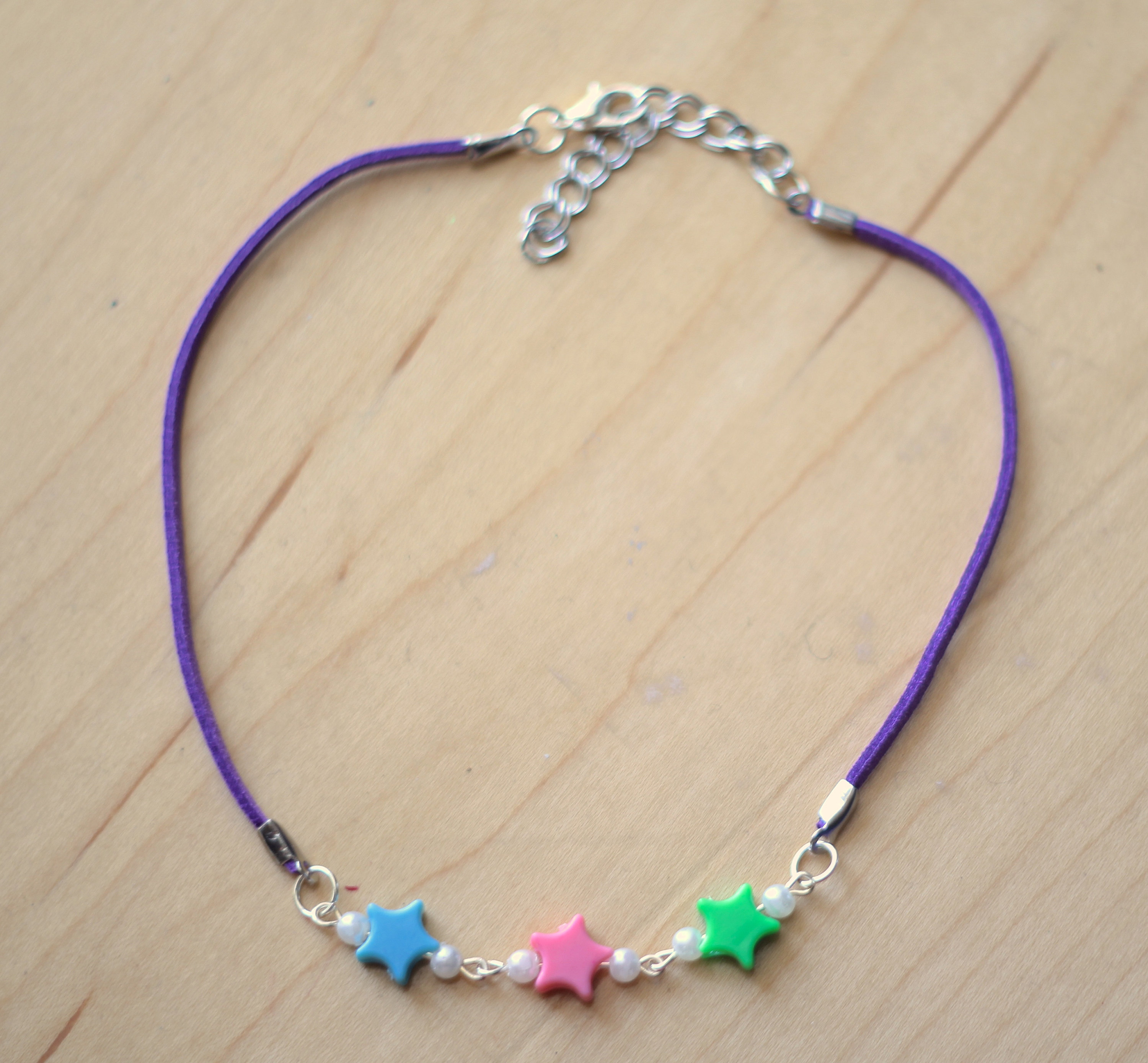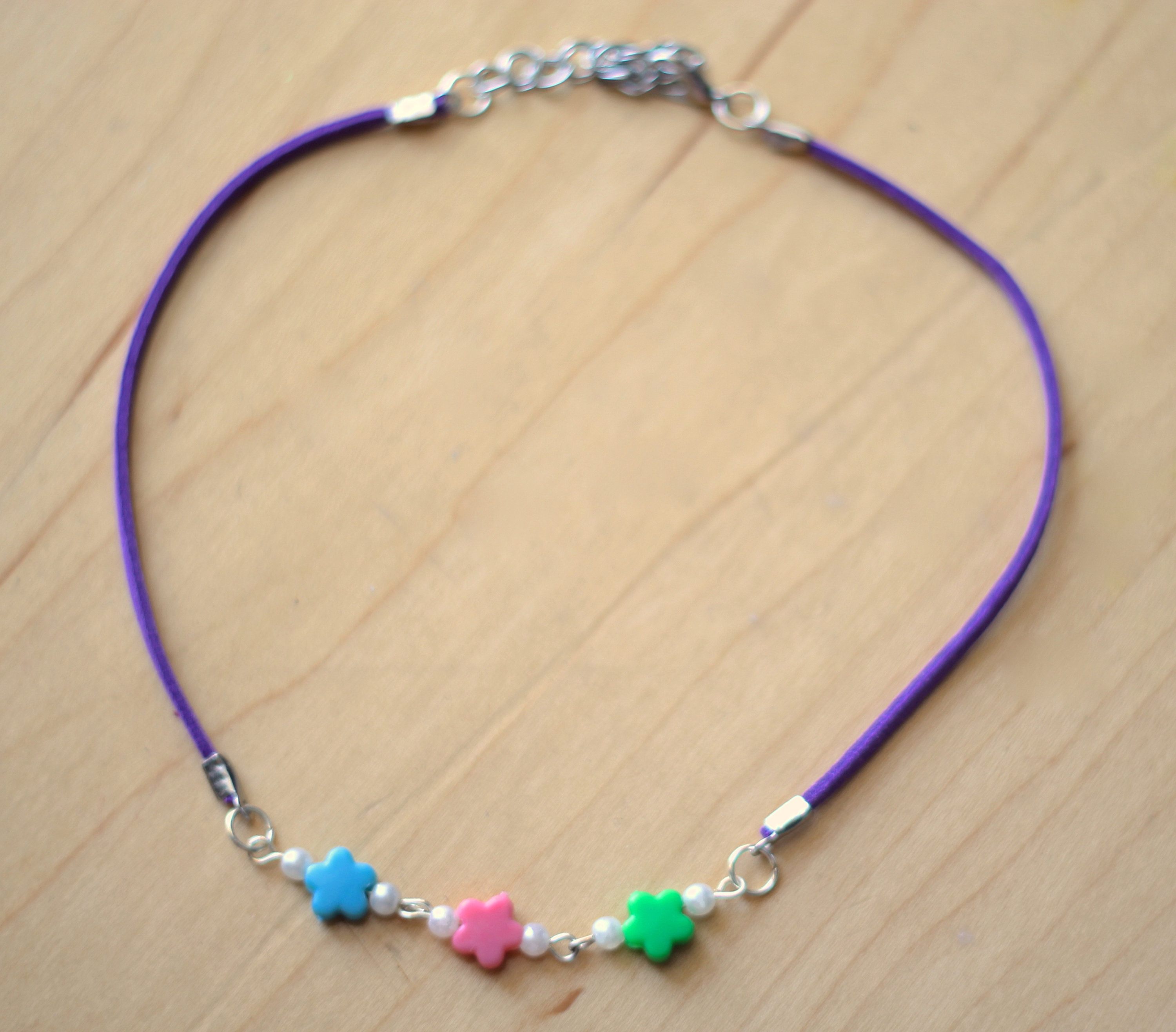 • Suede cord with three Kandi beads (blue, pink, and green)