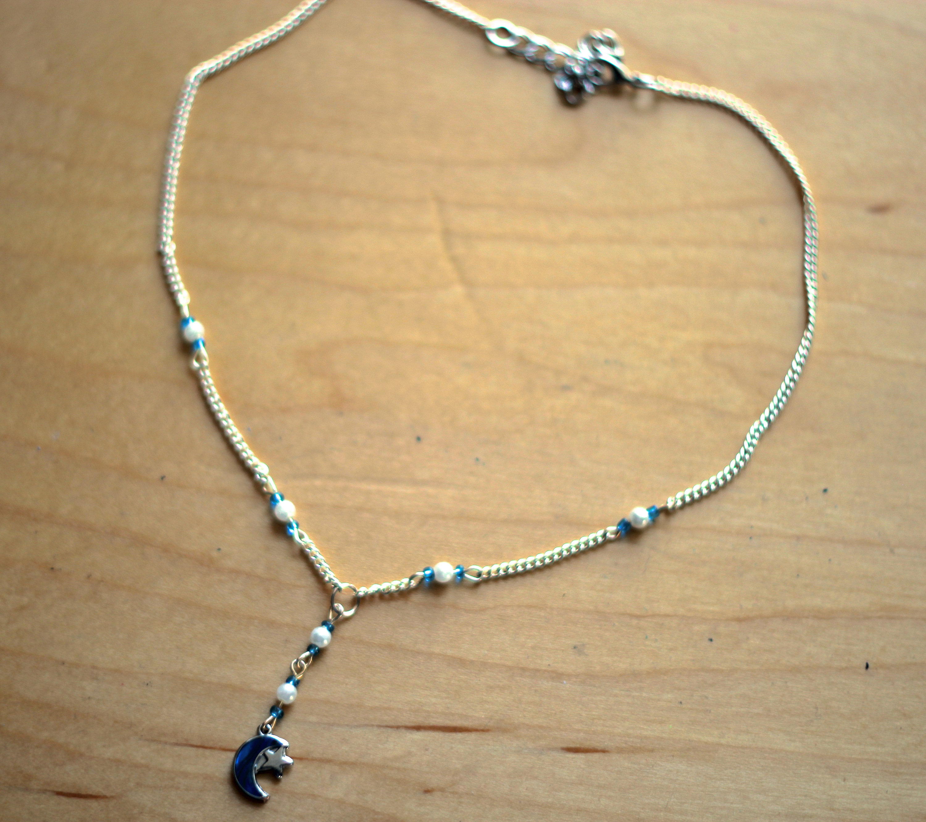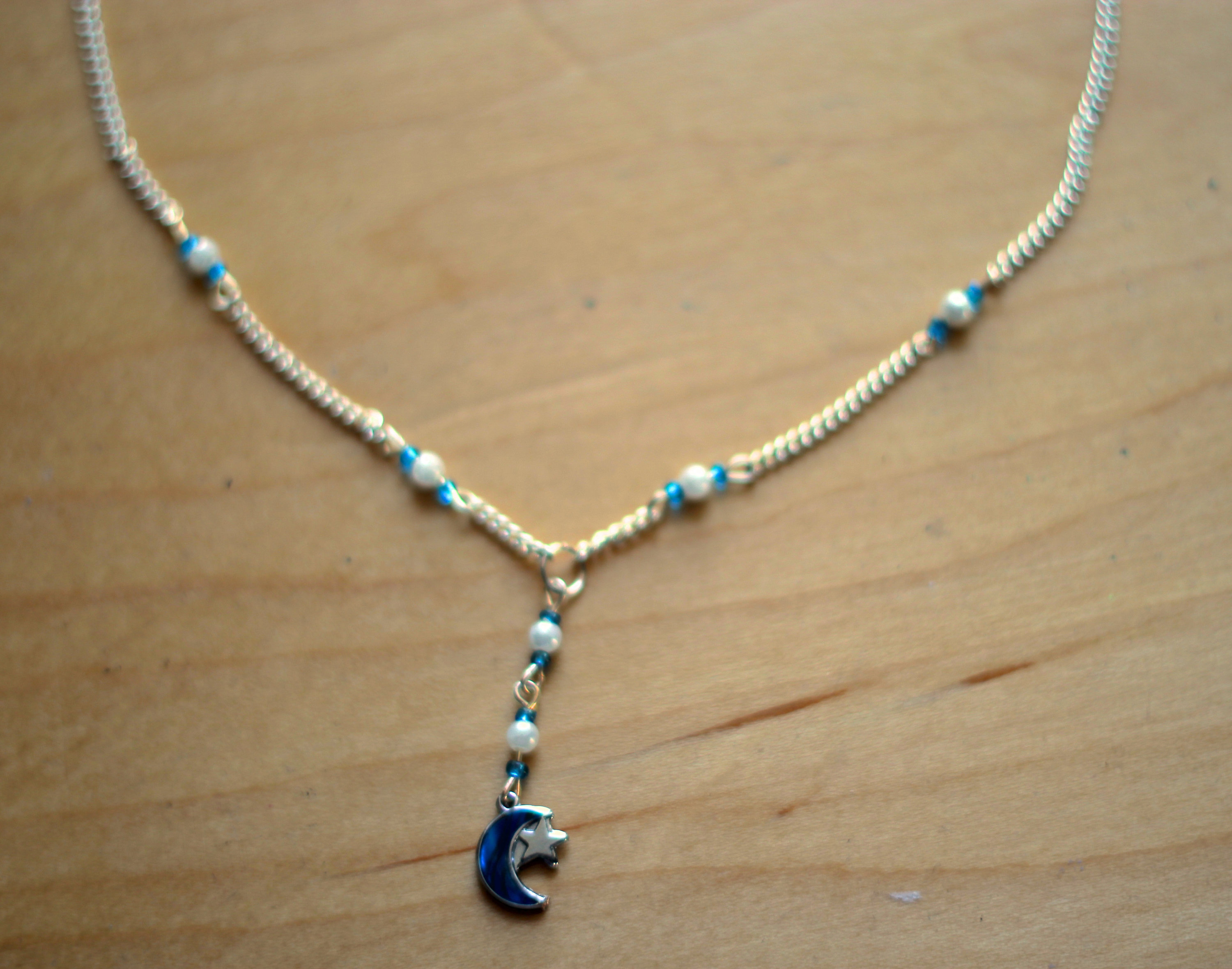 • Silver chain with pearl/blue bead accents and crescent moon pendant
