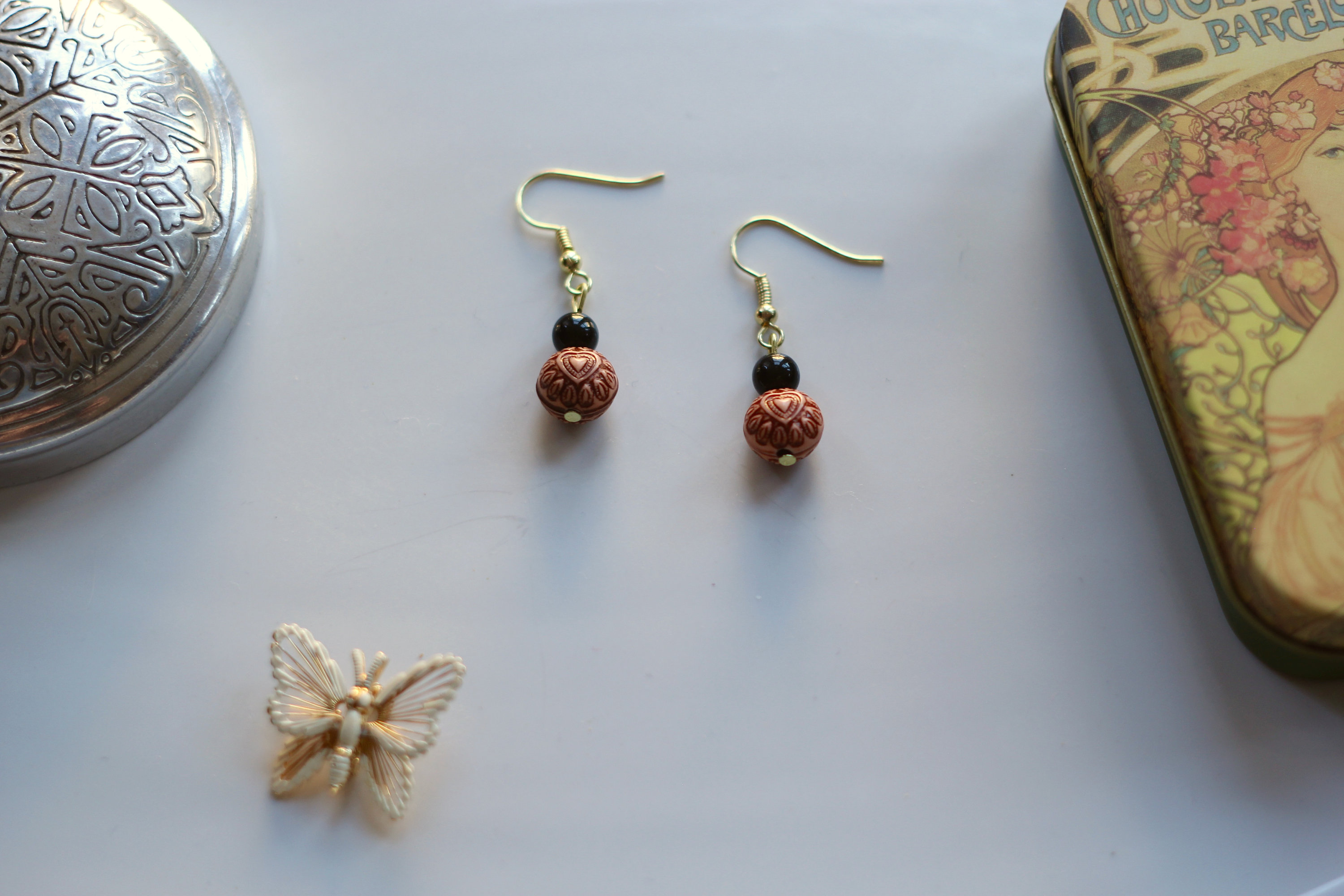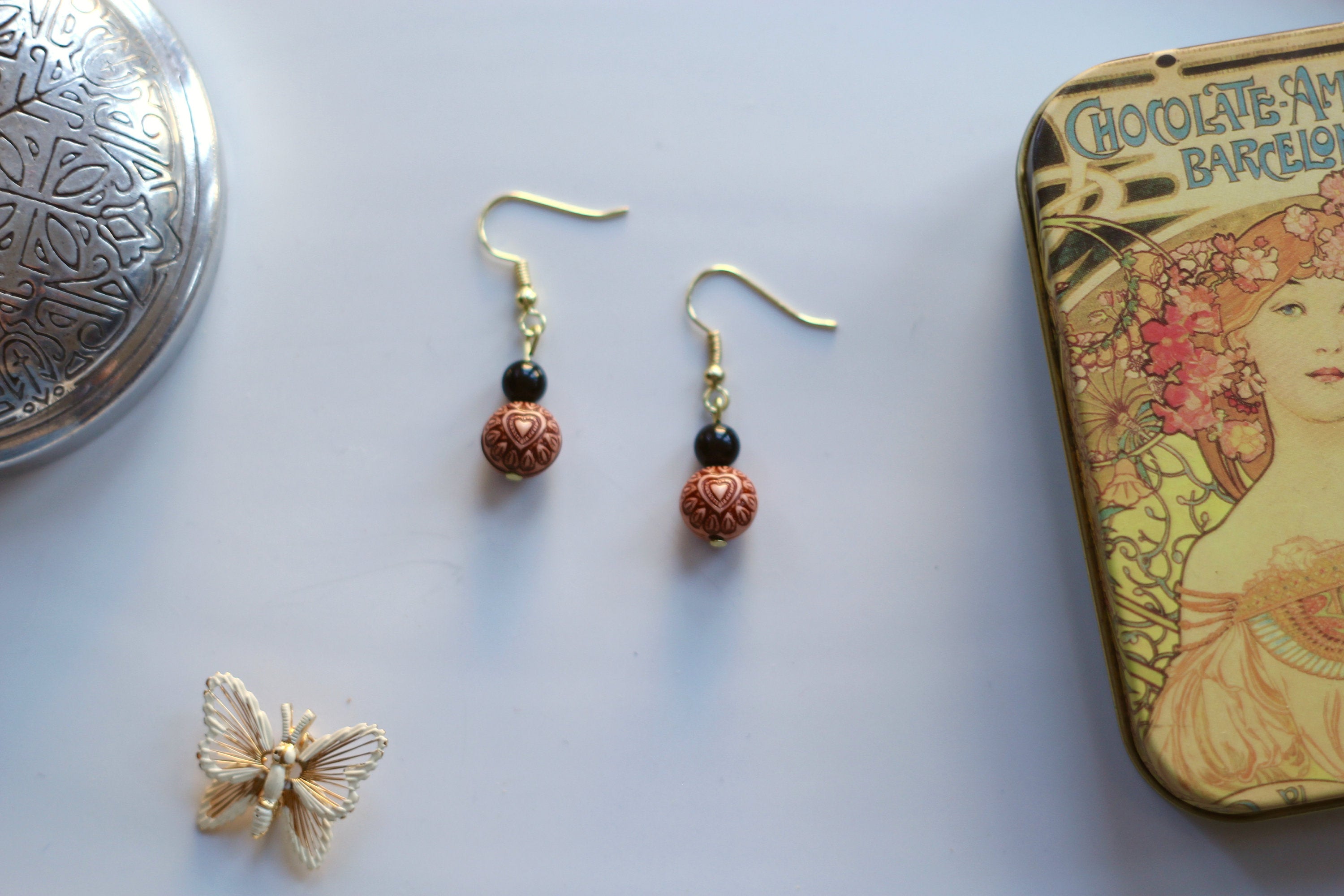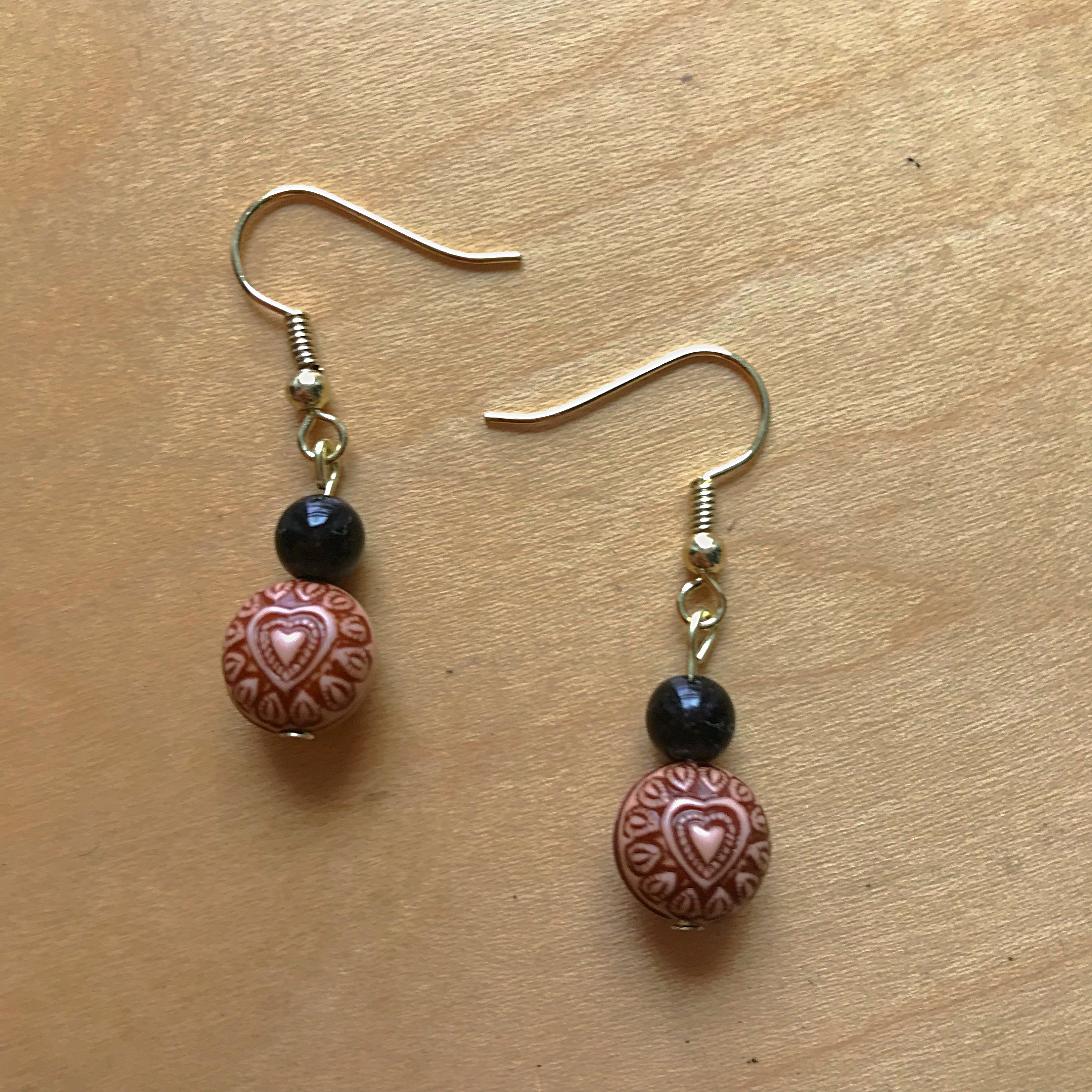 Wood bead earrings, Wood bead dangle, Black and Wood earrings, Wood heart earrings, Heart bead earrings, Black bead earrings