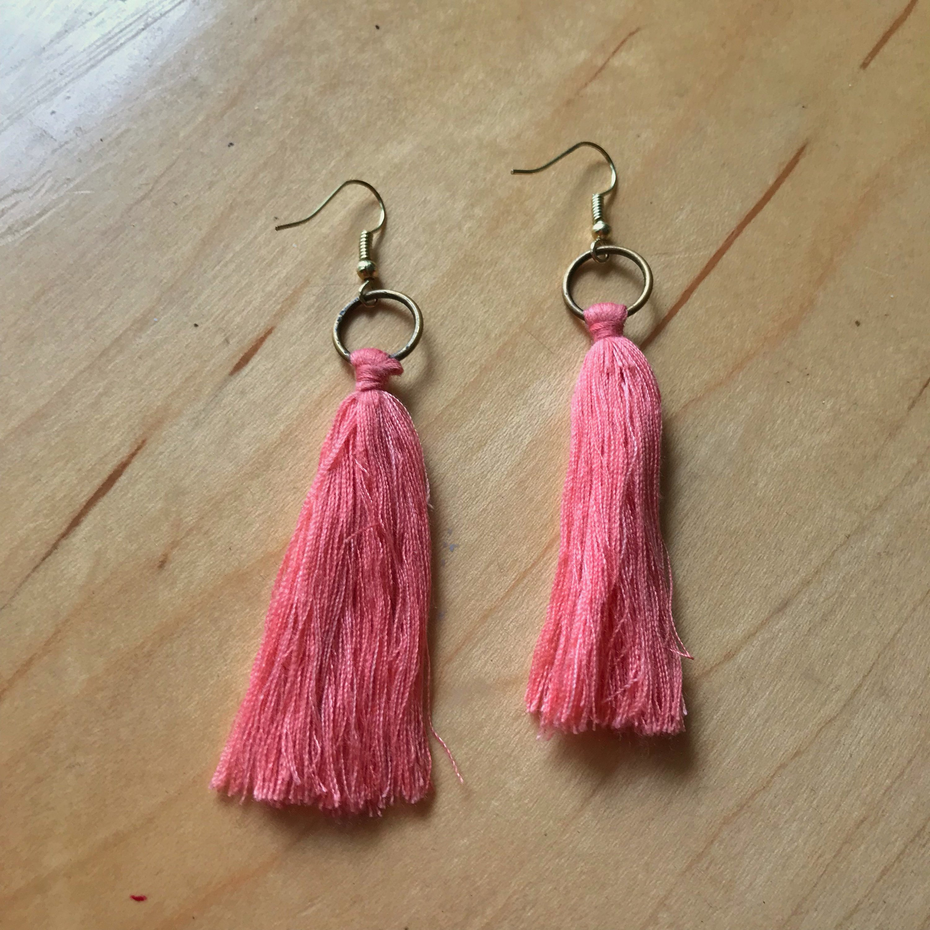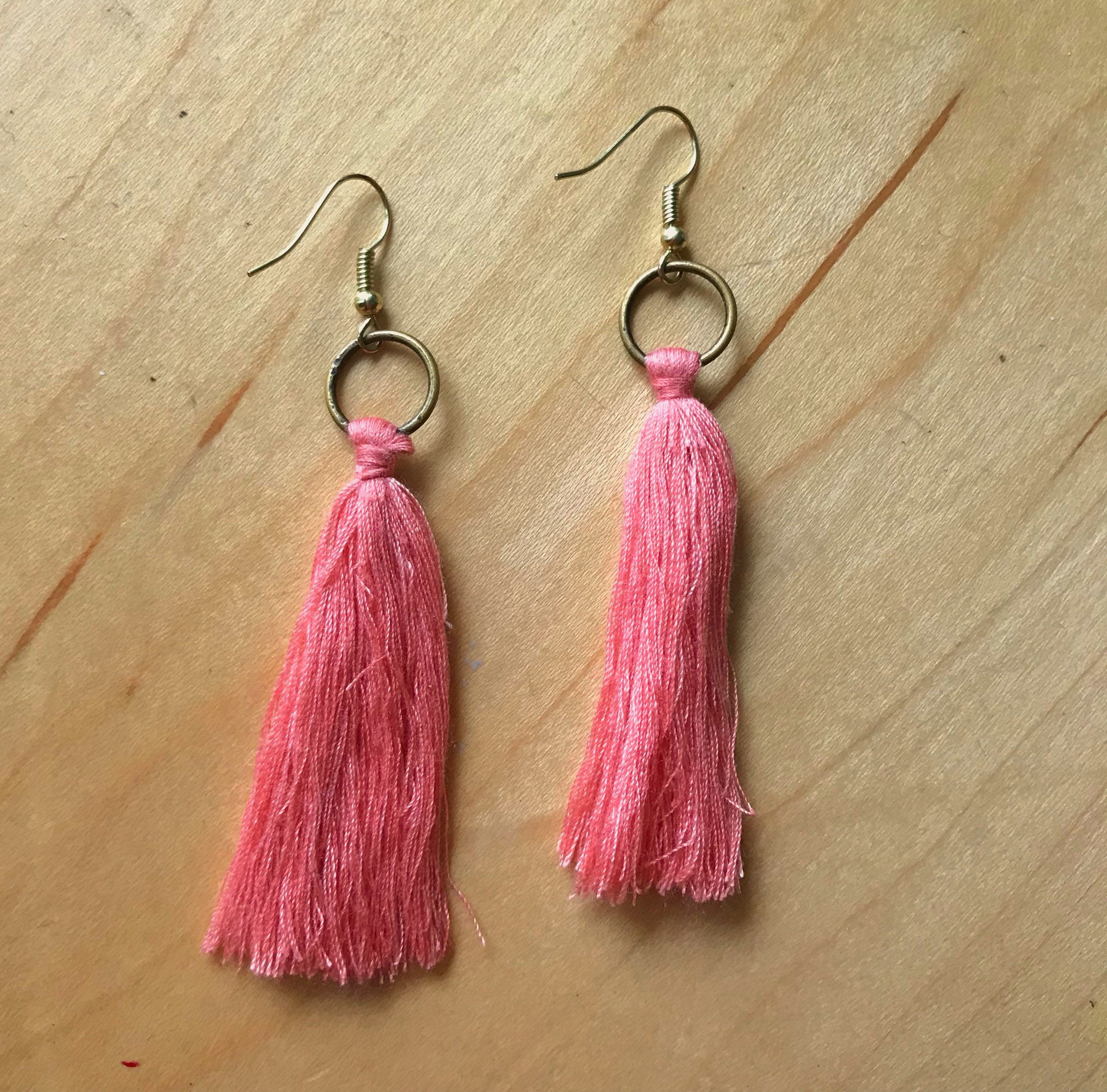 Coral Salmon Pink Thread Gold Hoop Hanging Tassel Earrings